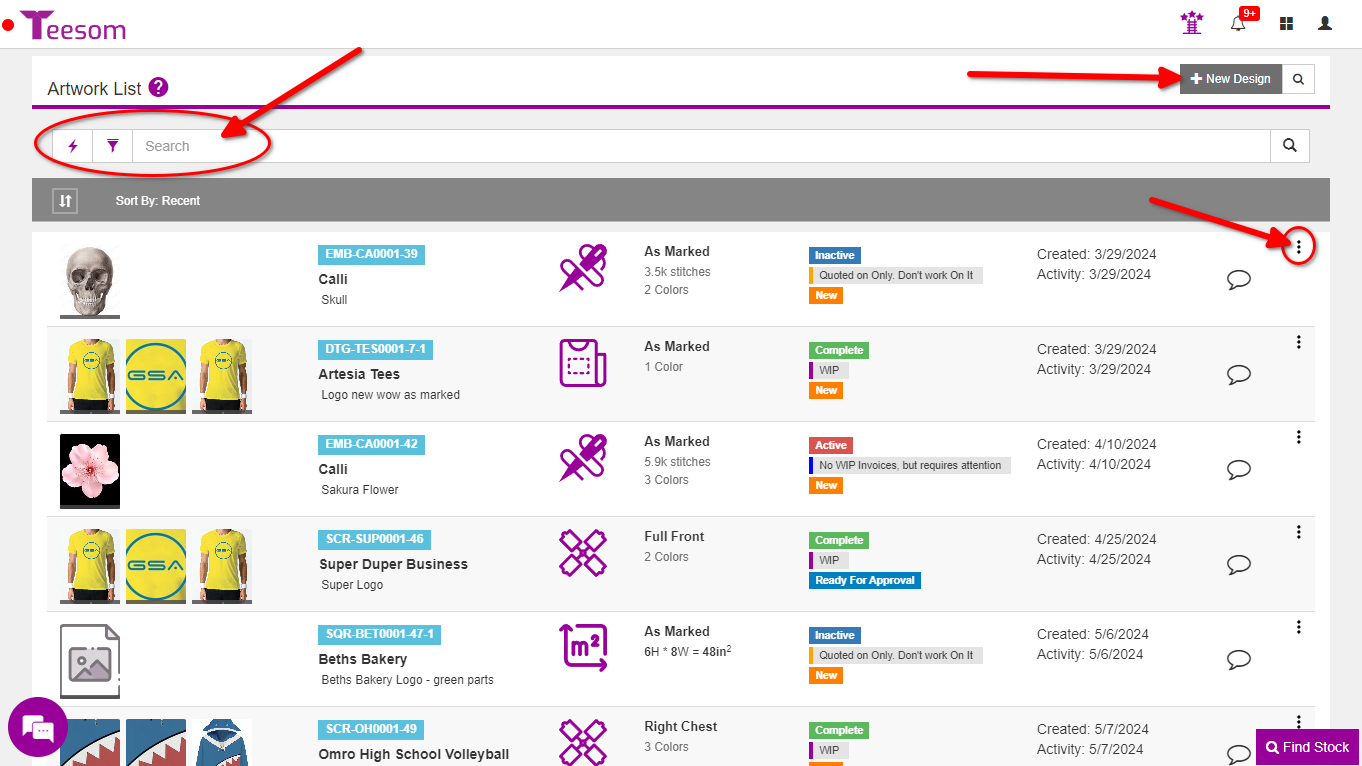 In Teesom, you can delete or archive artwork through the Artwork List. Open the 'Main Menu' and click on "Artwork". On the "Artwork List": Click the ‘3-dots‘ menu next to the artwork you would like to delete. Click “Delete.” Artwork that is in use on ...